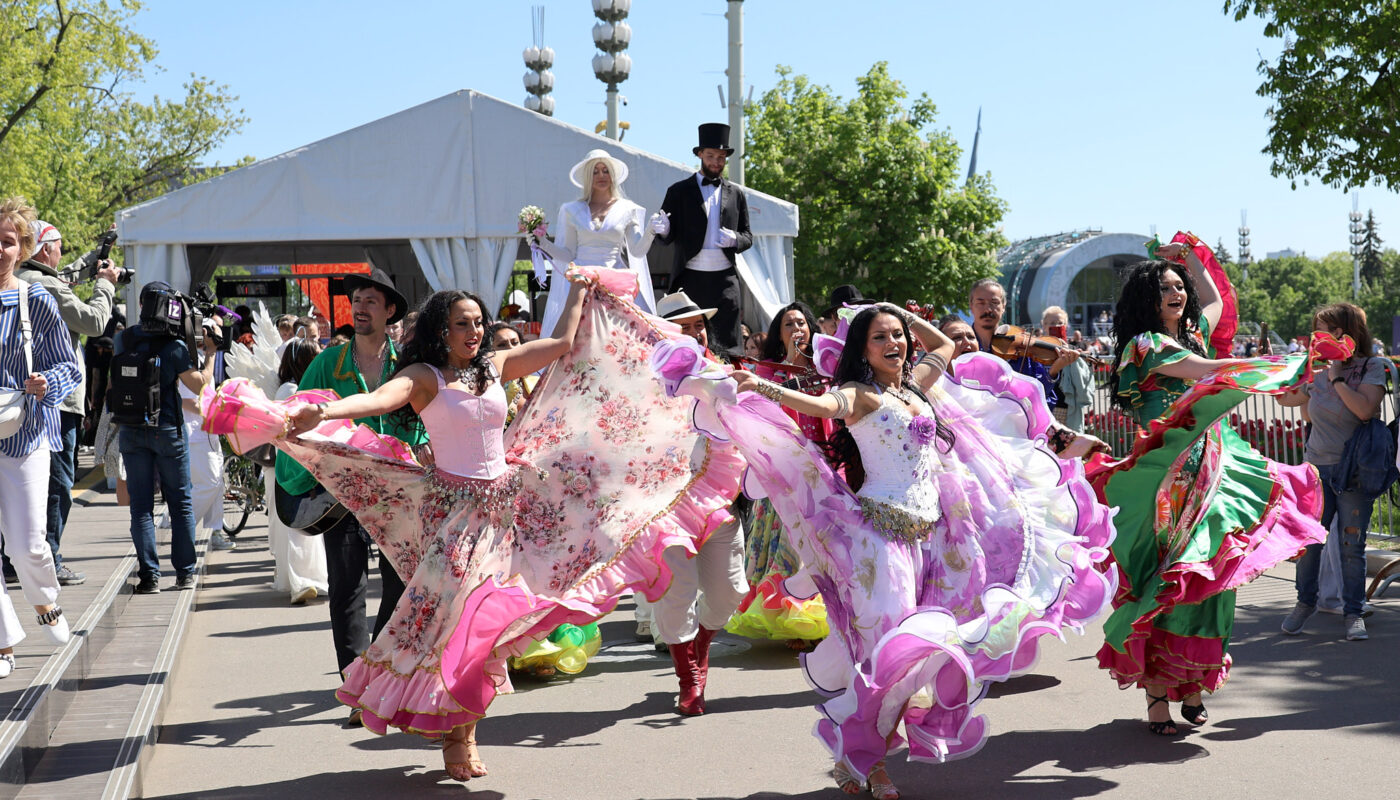 Первый Всероссийский свадебный фестиваль прошел на Выставке “Россия”. Он стартовал в первое воскресенье после Пасхи, 12 мая, — на Красную горку. В этот день на Главной уличной сцене Выставки прошла самая массовая одновременная церемония бракосочетания с участием 151 пары.