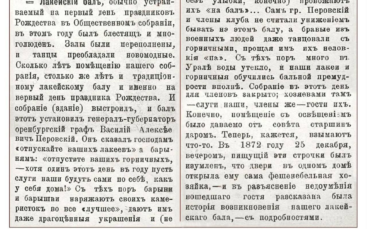 В архиве Оренбургской области хранится документ, который рассказывает о том, как праздновали Рождество в дореволюционной России. В Оренбуржье могла бы стать реальностью история о Золушке, ведь по инициативе губернатора Василия Перовского в городе раз в год, на Рождество, устраивали бал для лакеев. В этот день знатные дамы наряжали своих служанок и отправляли их на бал, а сами оставались без прислуги. Губернатор Перовский также присутствовал на этом торжестве.