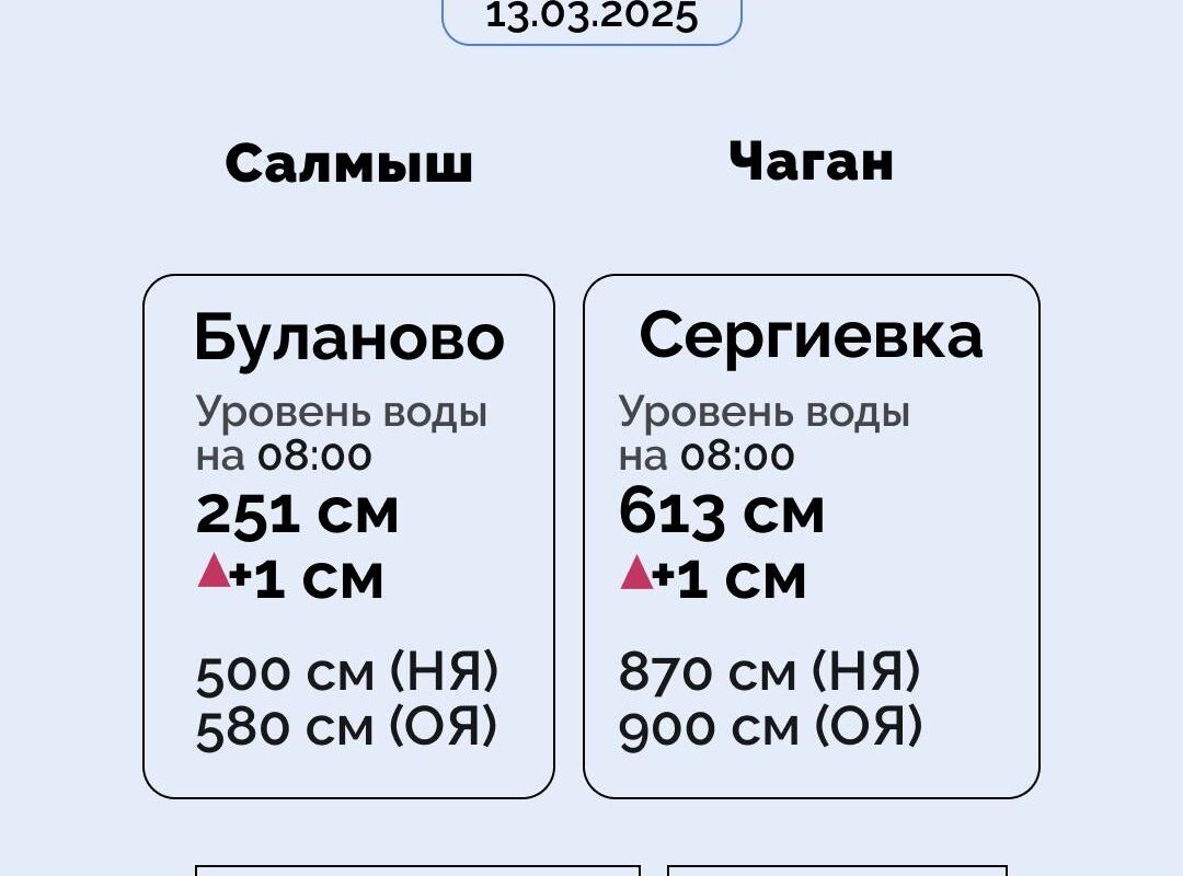 Также повысился уровень рек Салмыш в районе Буланово – 251 см (+1), Чаган в Сергиевке – 613 см (+1) и Большой Ик в Спасском – 358 (+1).
