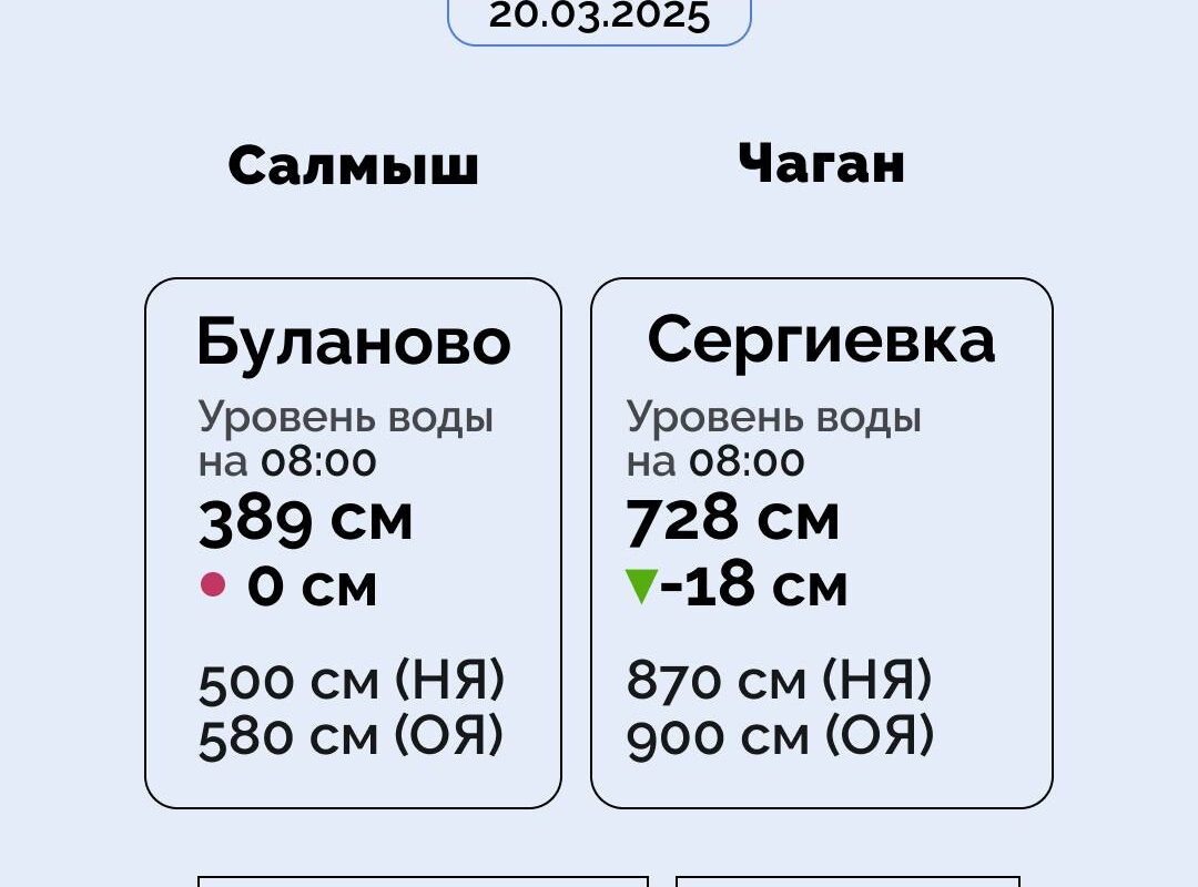 За сутки повысился уровень реки Урал: у Орска – 315 см (+3 см), у Оренбурга – 428 см (+4 см), у с. Илек – 351 см (+19 см). Также повысился уровень реки Сакмара у с. Татарская Каргала – 347 см (+74 см), у Кувандыка – 142 см (+108); реки Самара у Бузулука – 308 (+24).